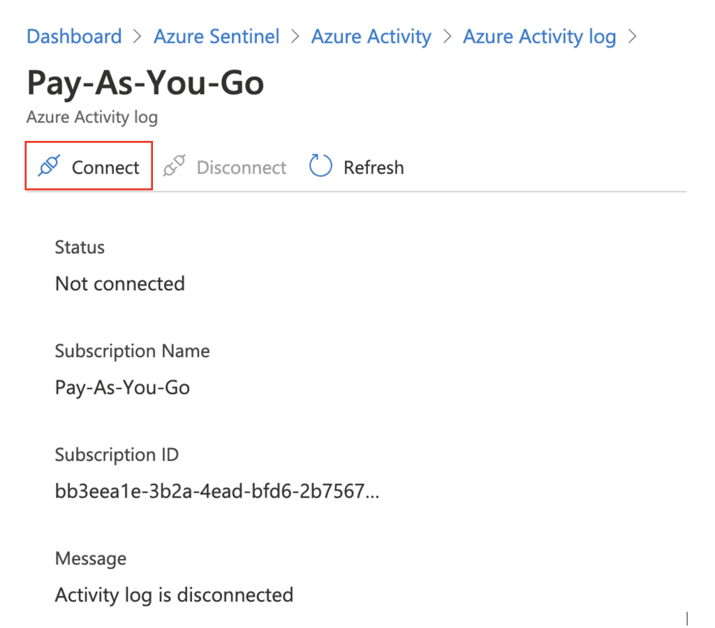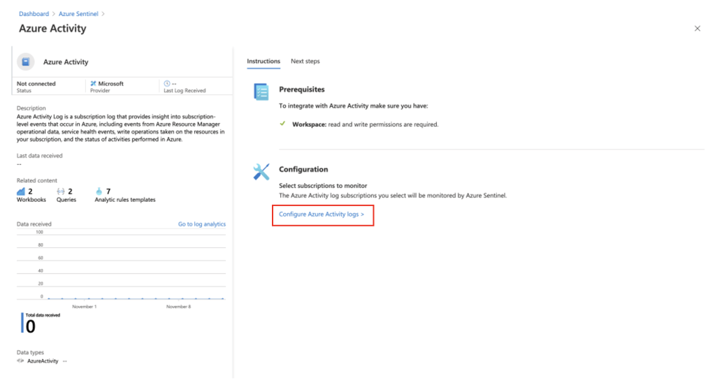 - Connect the Azure subscription to Azure Sentinel by clicking the Configure Azure Activity logs link in the Configuration section.